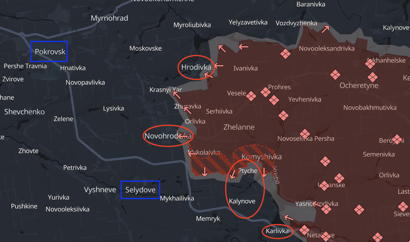 Postup Ruské federace na západ - ze strany obsazené Nikolajevky - má zřejmě stejný význam. To vše ve směru na dálnici vedoucí z Karlovky na Selidovo.