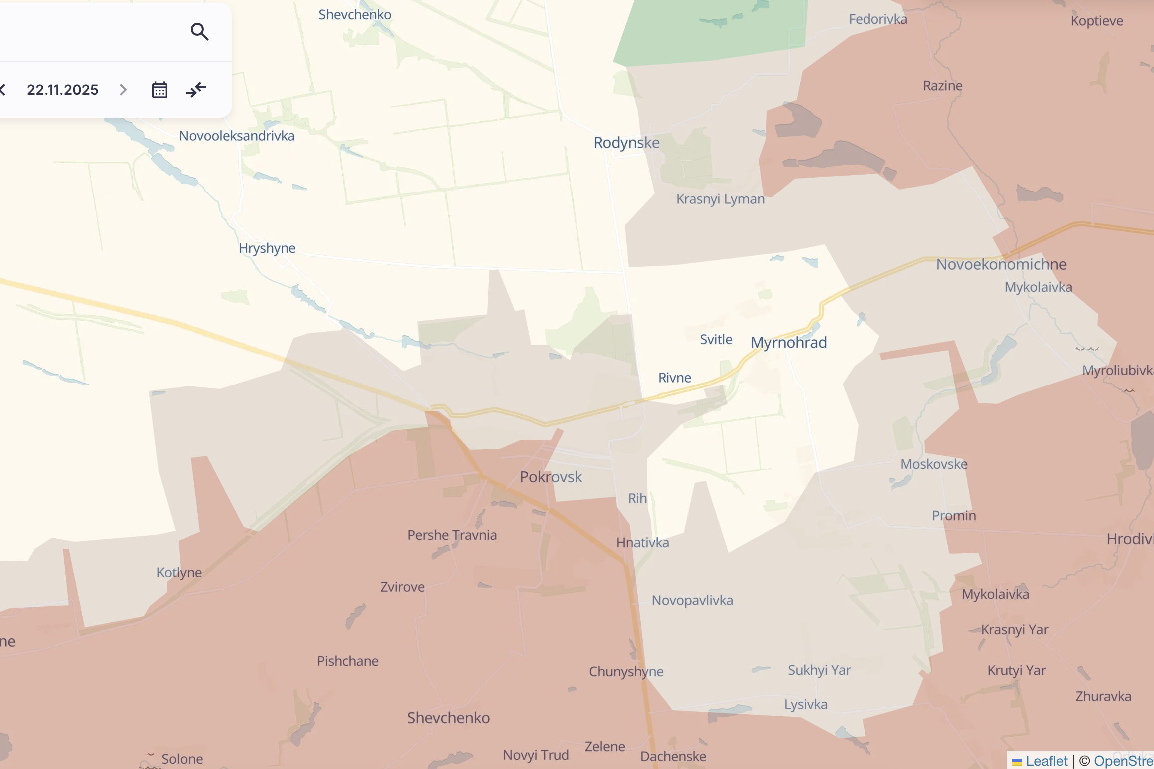 Ukazuje šedou zónu na jižním okraji města, poblíž dálnice. Také ukazuje ruský postup v široké oblasti jižně od Konstantinovky. Ruské vojenské skupiny a řada ukrajinských vojáků hlásí boje ve městě od začátku listopadu.