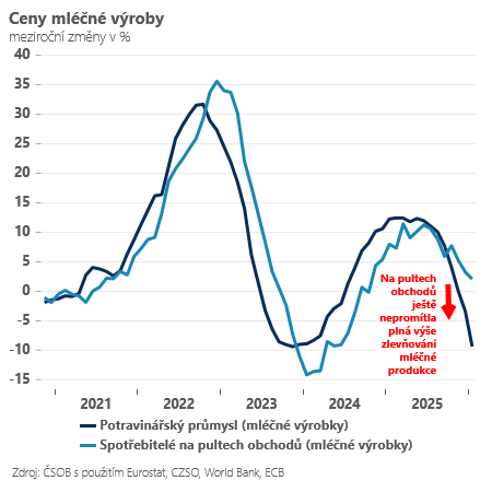 Ceny zemědělských výrobců byly v lednu nižší zejména díky rostlinné výrobě o 5,8 % (meziročně). U navazujících producentů potravin sice tak výrazné zlevňování nevidíme (-1,4 %), ceny v některých kategoriích v čele s „mlékaři“ a v Čechách tolik skloňovaným máslem však padají nečekaně prudce (-4,5 % v průměru celá kategorie). Minimálně část tohoto „výrobního překvapení“ se navíc zatím nedostala na pulty ke spotřebitelům. Proto snižujeme odhad vývoje cen potravin v obchodech pro nadcházející měsíce a celý letošní rok z 2,5 % na 1 %. A to bude mít dopad i na náš odhad celkové inflace, který zatím snižujeme pro celý rok 2026 z 1,5 % na 1,4 %. Měla by na to reagovat centrální banka? Tedy, jak se ptáme v úvodu, může vést levnější máslo nakonec i k levnějším hypotékám?