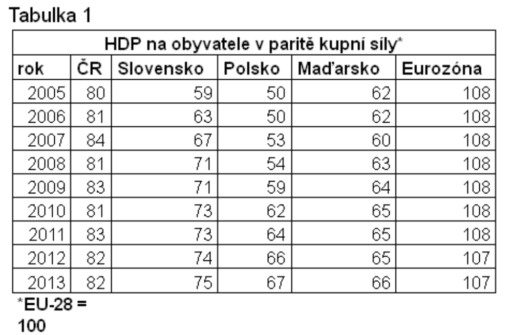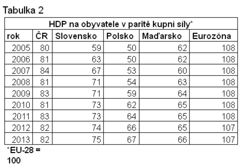 Česká republika zaostává za ostatními státy V4, a to zejména za Polskem a Slovenskem v posledních téměř nejméně osmi letech zaostává v dynamice vývoje HDP (tab. 1), HDP na obyvatele v paritě kupní síly (tab. 2), v dynamice produktivity práce (tab. 3) i v HDP přepočítaném na pracovníka a HDP přepočítaném na odpracovanou hodinu (tab. 4).