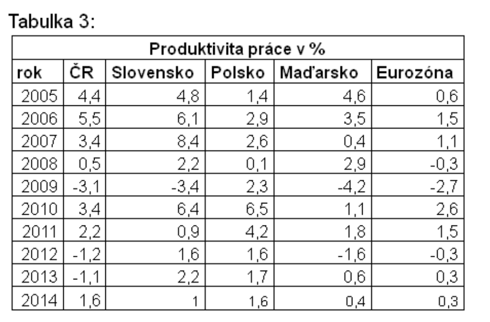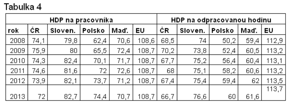 Pokud se podíváme na HDP na pracovníka a HDP na odpracovanou hodinu. V obou těchto ukazatelích v letech 2008 -2013 v ČR výkonnost klesala a to ze 74,1 % průměru EU na 72 %. Na Slovensku naopak rostla ze 79 % na 82,7 % a v Polsku rostla dokonce skokem z 62,4 % v roce 2008 na 74,4 % celoevropské úrovně v roce 2013.