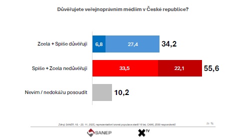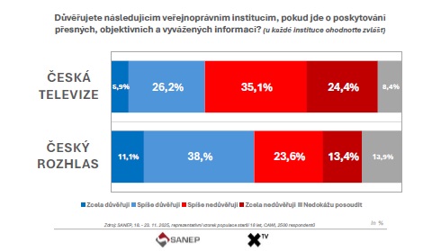 Exkluzivní průzkum společnosti SANEP pro televizi XTV zkoumal, jak Češi vnímají veřejnoprávní média. Na reprezentativním vzorku 2 500 obyvatel ČR a zjišťoval důvěru v Českou televizi, Český rozhlas a Českou tiskovou kancelář, hodnocení jejich objektivity i postoje k financování a možnému sloučení institucí. Šetření proběhlo mezi 18. a 23. listopadem.