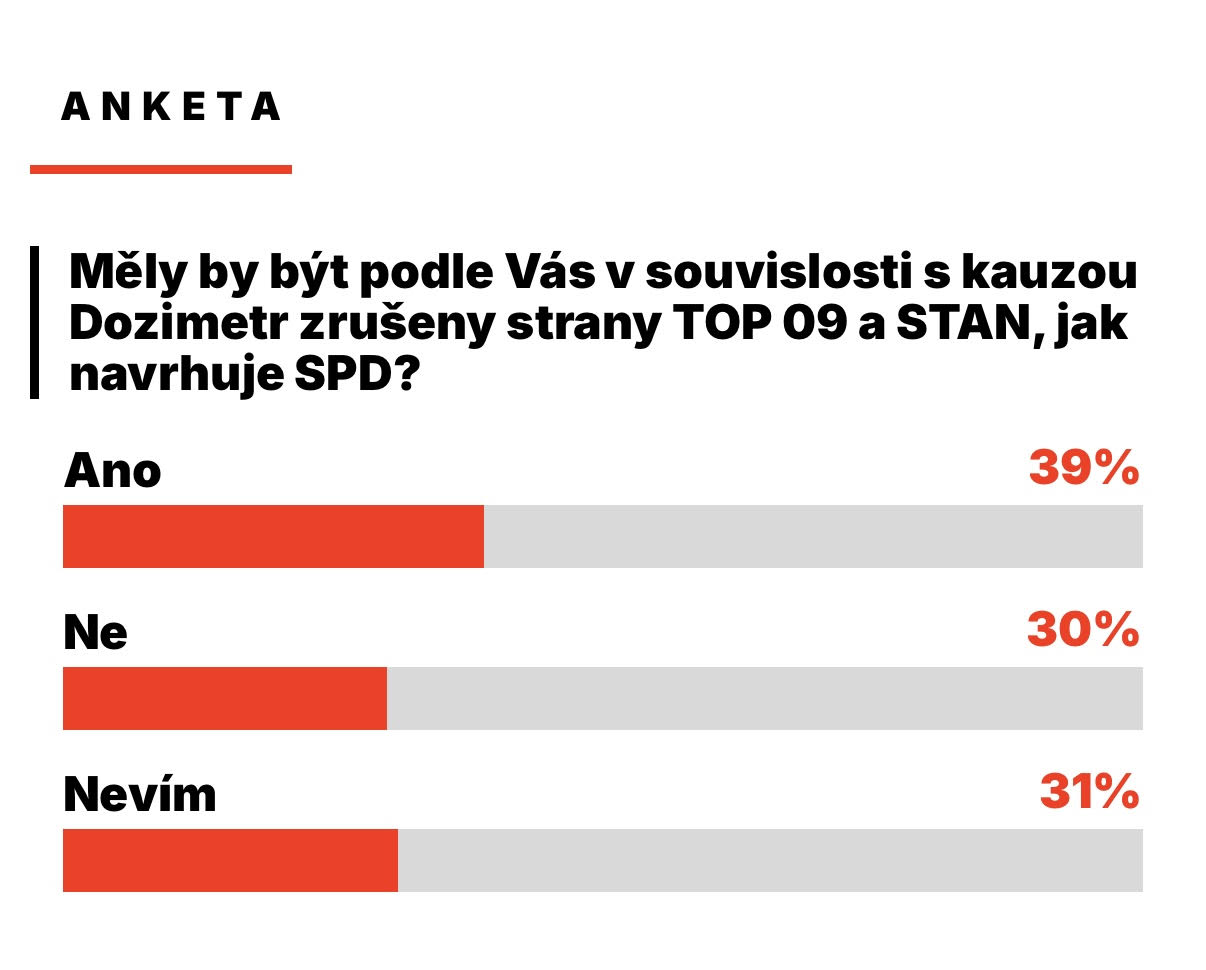 Čtenářská anketa na serveru První zprávy, ve které hlasovalo v průběhu týdne 50.674 čtenářů a která se ptala, zda by měly být v souvislosti s kauzou Dozimetru zrušeny strany TOP 09 a STAN podle návrhu SPD, dopadla těsně. Pro zákaz se vyslovilo 39 % hlasujících, proti bylo 30 % a 31 % označilo možnost „nevím“. Ačkoli se nejedná o průzkum na reprezentativním vzorku obyvatel, ale jde o internetové hlasování čtenářů našeho serveru, i tak výsledky naznačují, jak hluboko kauza zasahuje do předvolební atmosféry.