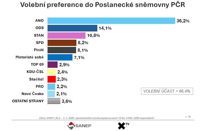 Nejnovější volební model agentury SANEP, který vznikl exkluzivně pro XTV, naznačuje, že česká politická scéna se několik měsíců po sněmovních volbách z října 2025 pohybuje spíše ve fázi konsolidace než dramatických změn. Přesto jsou v aktuálních číslech patrné posuny, které stojí za pozornost. Především jde o další posílení hnutí ANO vedeného Andrejem Babišem, které podle modelu dosahuje podpory 36,2 procenta.