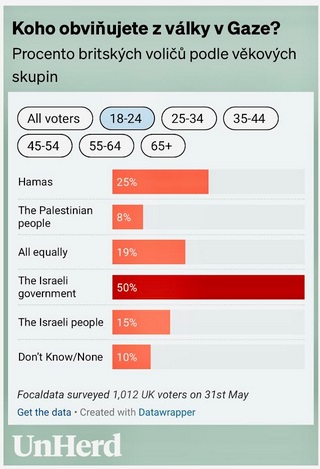 UnHerd.com na stejné téma. V samostatné otázce byli mladí respondenti dotázáni, kdo je více vinen za válku v Gaze. Polovina z nich obvinila izraelskou vládu, zatímco čtvrtina odpověděla, že Hamas. Pouze 19 % uvedlo „všichni stejně.“