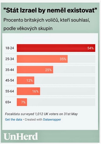 Většina mladých Britů si nemyslí, že by Izrael měl existovat, odhalil nový průzkum UnHerd. Předběžné výsledky exkluzivního průzkumu zahrnujícího 1 012 voličů, který se zaměřoval na zahraniční politiku a který provedla agentura Focaldata, odhalily, že ohromujících 54 % lidí ve věku 18-24 let souhlasilo s tvrzením, že „stát Izrael by neměl existovat.“ Jen 21 % nesouhlasilo.