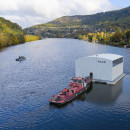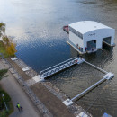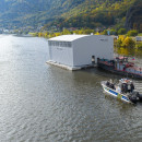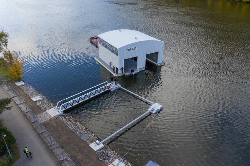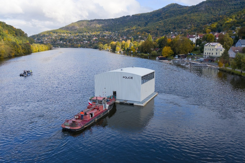Ředitelství vodních cest České republiky dokončilo přesun hotových konstrukcí plovoucího krytého stání pro služební plavidla Policie České republiky na Labi v Ústí nad Labem.