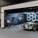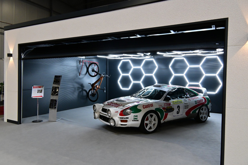 Automobil pro rally zaparkovaný v prostorné garáži kam se vejdou i kola byl nepřehlednutelný