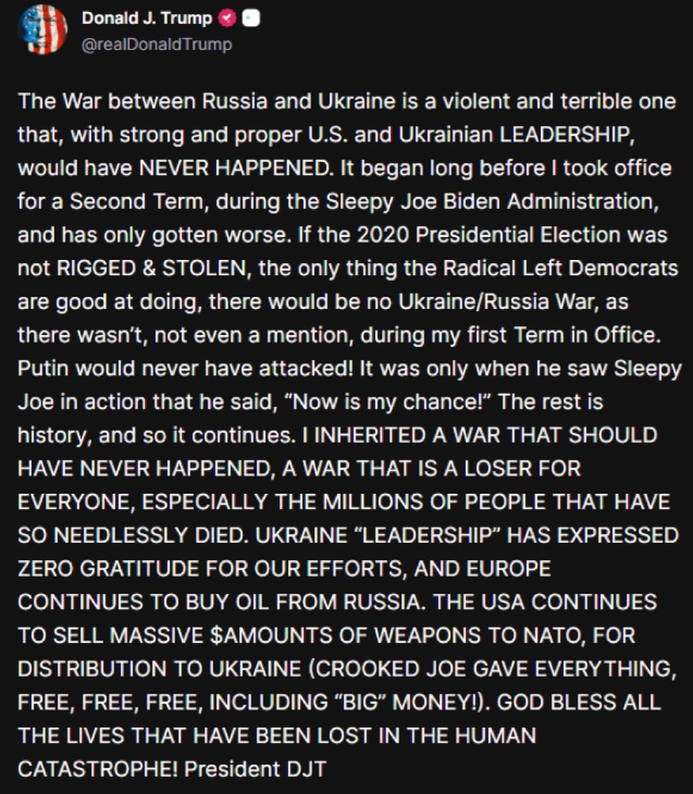 „Válka mezi Ruskem a Ukrajinou je násilný a hrozný konflikt, který by se silným a správným americkým a ukrajinským vedením nikdy nestal. Začal dlouho předtím, než jsem se ujal druhého funkčního období, za vlády Spícího Joea Bidena , a jen se zhoršil.“
