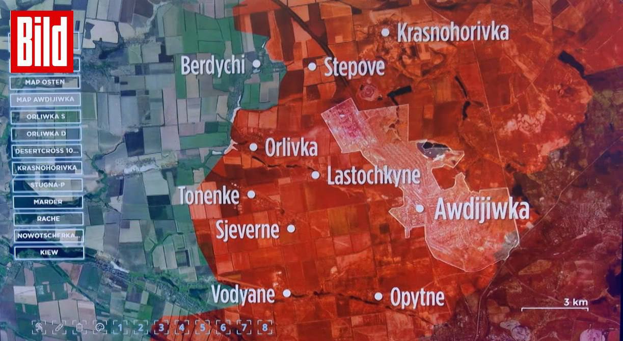 Ruské jednotky dobyly vesnice Toněnkjoe a Orlovku, západně od Avdějevky, uvedl vojenský analytik Bildu Julian Röpke.