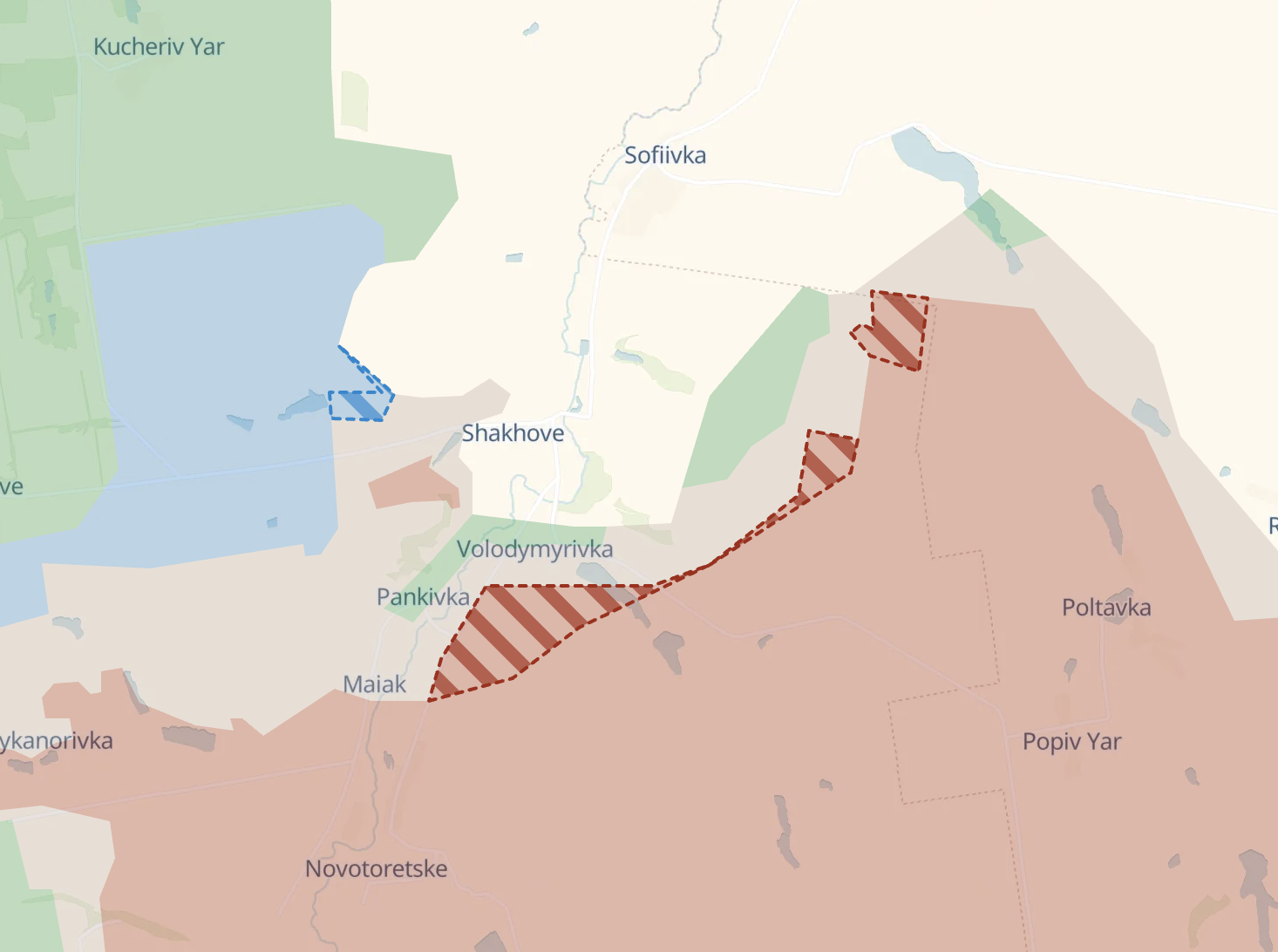 Na severozápadních přístupech k Pokrovskému okresu postoupili Rusové severně od Udačného až kilometr podél místa vylodění a snaží se rozšířit své obklíčení od západu podél linie Udačný-Kotlino. Zároveň se neúspěšně pokoušejí prorazit z průmyslové zóny Pokrovska ke Grišinu.