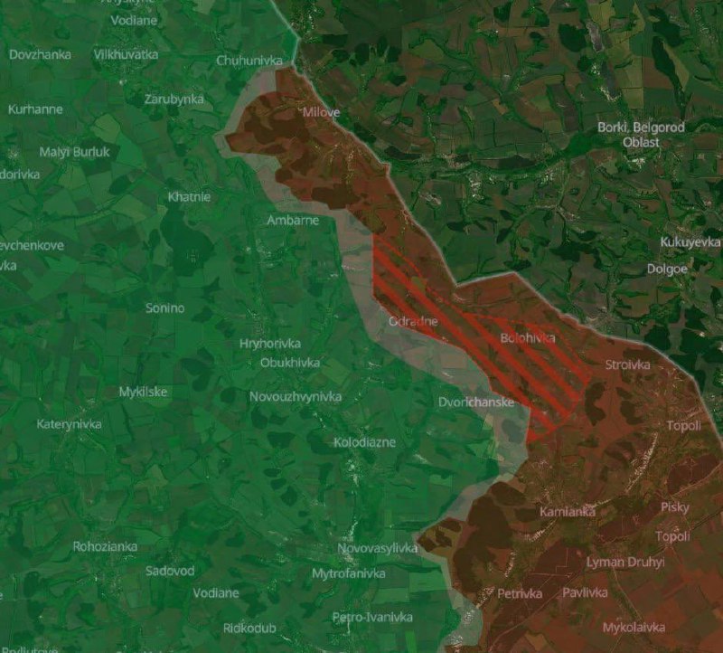 Podle webu ruští vojáci dobyli Otradnoje a Bologovku v Charkovské oblasti na hranici s Ruskem a ve stejné oblasti postoupili poblíž Dvurečanskovo.