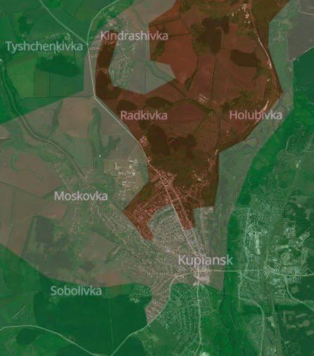 Dále se výrazně rozšířila „šedá zóna“ v Kupjansku. Soudě dle mapy je pod kontrolou ukrajinských ozbrojených sil mimo šedou zónu pouze jižní okraj města.