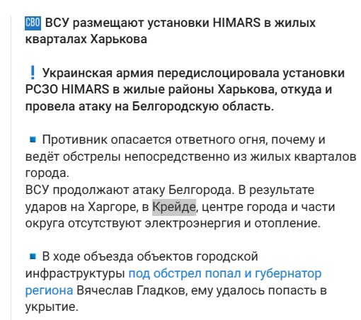 Během prohlídky městské infrastruktury, která byla zasažena útoky, se pod palbu dostal i guvernér Bělgorodské oblasti Vjačeslav Gladkov. Údajně se mu podařilo skrýt a nebyl zraněn.
