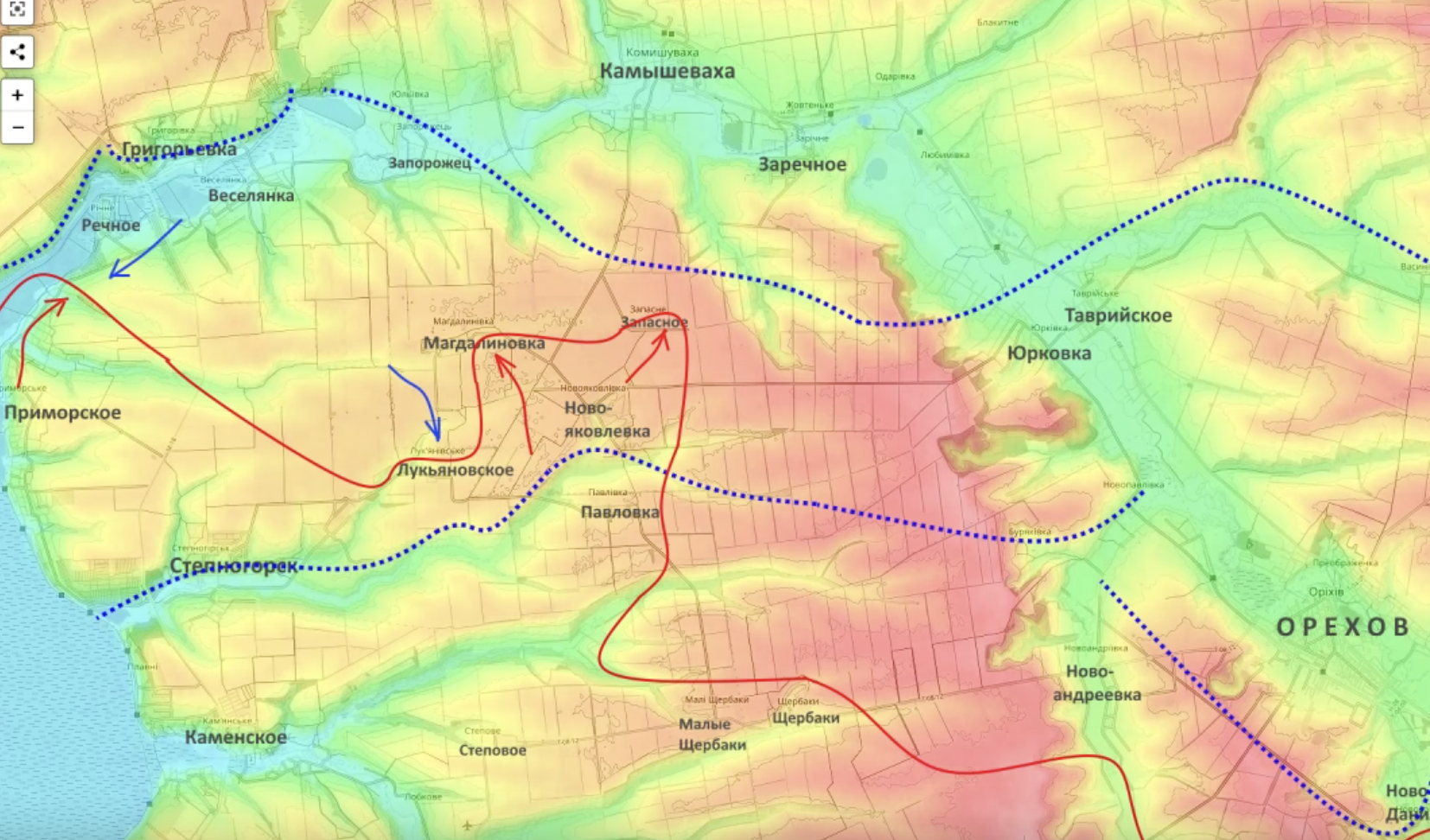Dále na sever, v oblasti Velikomychajlovky, kam se ukrajinským jednotkám podařilo postoupit (jak potvrdila organizace Deep State), Rusové zahájili protiútok a snaží se dobýt zpět ztracené pozice. Ukrajinské ozbrojené síly se však snaží své pozice upevnit.