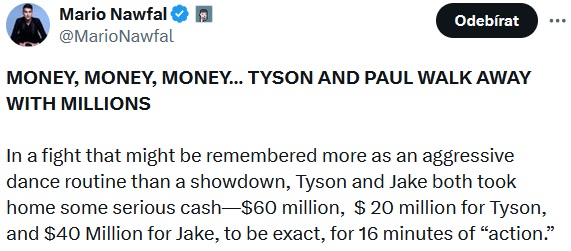 Mike Tyson a Jake Paul si při kontroverzním exhibičním zápase přišli na desítky milionů dolarů. Zápas, který na sociálních sítích okomentoval i Mario Nawfal, však spíše než sportovní výkon připomínal komediální show s jednou z nejdražších „facek“ v historii boxu.